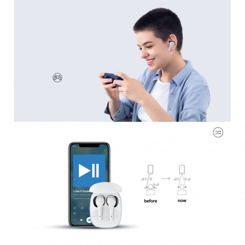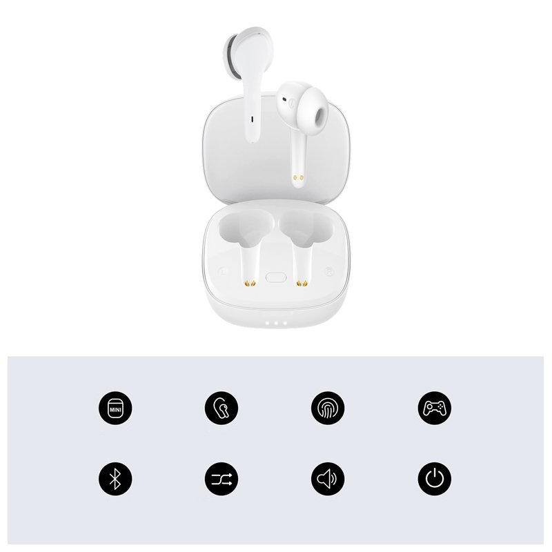 Les écouteurs sans fil Bluetooth intra-auriculaires sont parfaits pour écouter de la musique et jouer à des jeux. Un son dynamique et des basses profondes garantissent une expérience d'écoute extraordinaire. En revanche, les joueurs seront satisfaits du temps de retard du son proche de zéro par rapport à l'image visible à l'écran. La vitesse de transfert de données du combiné est due à la dernière version de Bluetooth 5.1. Ils sont entièrement compatibles avec les appareils Android et iOS. Leur forme ergonomique assure le plus grand confort de port, même pendant de longues heures d'utilisation. Ils n'ont pas peur de l'humidité. Vous pouvez faire du sport sans craindre de transpirer. Un étui léger et compact qui contient vos écouteurs Bluetooth se glisse facilement dans votre poche. Son design est moderne et de bon goût. Les écouteurs jouent jusqu'à 5 heures . Il est possible de basculer entre la lecture mono et stéréo.