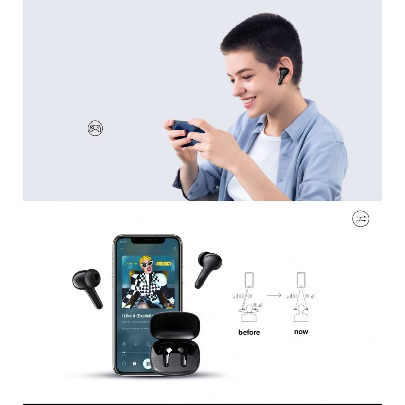 Les écouteurs sans fil Bluetooth intra-auriculaires sont parfaits pour écouter de la musique et jouer à des jeux. Un son dynamique et des basses profondes garantissent une expérience d'écoute extraordinaire. En revanche, les joueurs seront satisfaits du temps de retard du son proche de zéro par rapport à l'image visible à l'écran. La vitesse de transfert de données du combiné est due à la dernière version de Bluetooth 5.1. Ils sont entièrement compatibles avec les appareils Android et iOS. Leur forme ergonomique assure le plus grand confort de port, même pendant de longues heures d'utilisation. Ils n'ont pas peur de l'humidité. Vous pouvez faire du sport sans craindre de transpirer. Un étui léger et compact qui contient vos écouteurs Bluetooth se glisse facilement dans votre poche. Son design est moderne et de bon goût. Les écouteurs jouent jusqu'à 5 heures . Il est possible de basculer entre la lecture mono et stéréo.