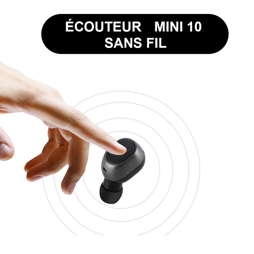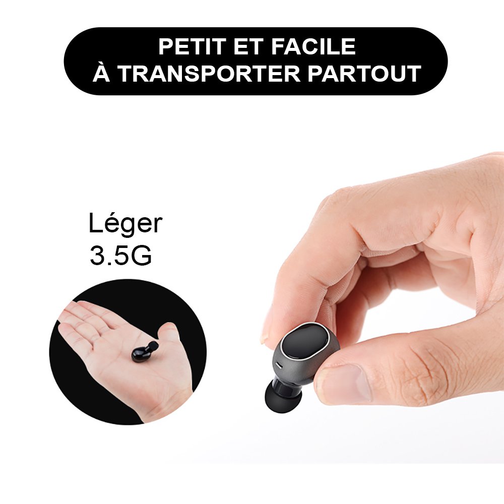 Ecouteur Bluetooth V4.1 sans fil facile à placer et à utilisergrâce à son design ergonomiqueIl dispose d’une version Bluetooth 4.1 c'est-à-dire avec transmission rapide, portée de transmission jusqu'à 10 mètres (Max).Grâce à sa surface tactile, vous disposez de plusieurs fonction, en effet en tapant une fois vous pouvez répondre à vos appels ou raccrocher, mettre en marche ou en pause votre musique …..Cet écouteur est idéal pour écouter de la musique et recevoir des appels tout en faisant de l'exercice et est compatible avec n'importe quel appareil Bluetooth Batterie au lithium intégrée, faible dissipation de puissance, longue durée de fonctionnementCaractéristiques:-Taille de l'objet : 2,7 * 1,2 cm-Types de batterie : Li-ion-Contenu du colis : 1 x écouteur Bluetooth, 1 x manuel, 1 x câble de charge USB-Poids de l'article : 4 g-Temps de conversation : env. 5 heures-Version Bluetooth : V4.1-Temps de musique : 3-5 heures-temps de charge : environ 2 heures-Temps d'attente : jusqu'à 300 heures-Gamme de fréquences : 2,4 GHz-Distance de transmission : 10 m-Interfaces : 1 x port micro USB