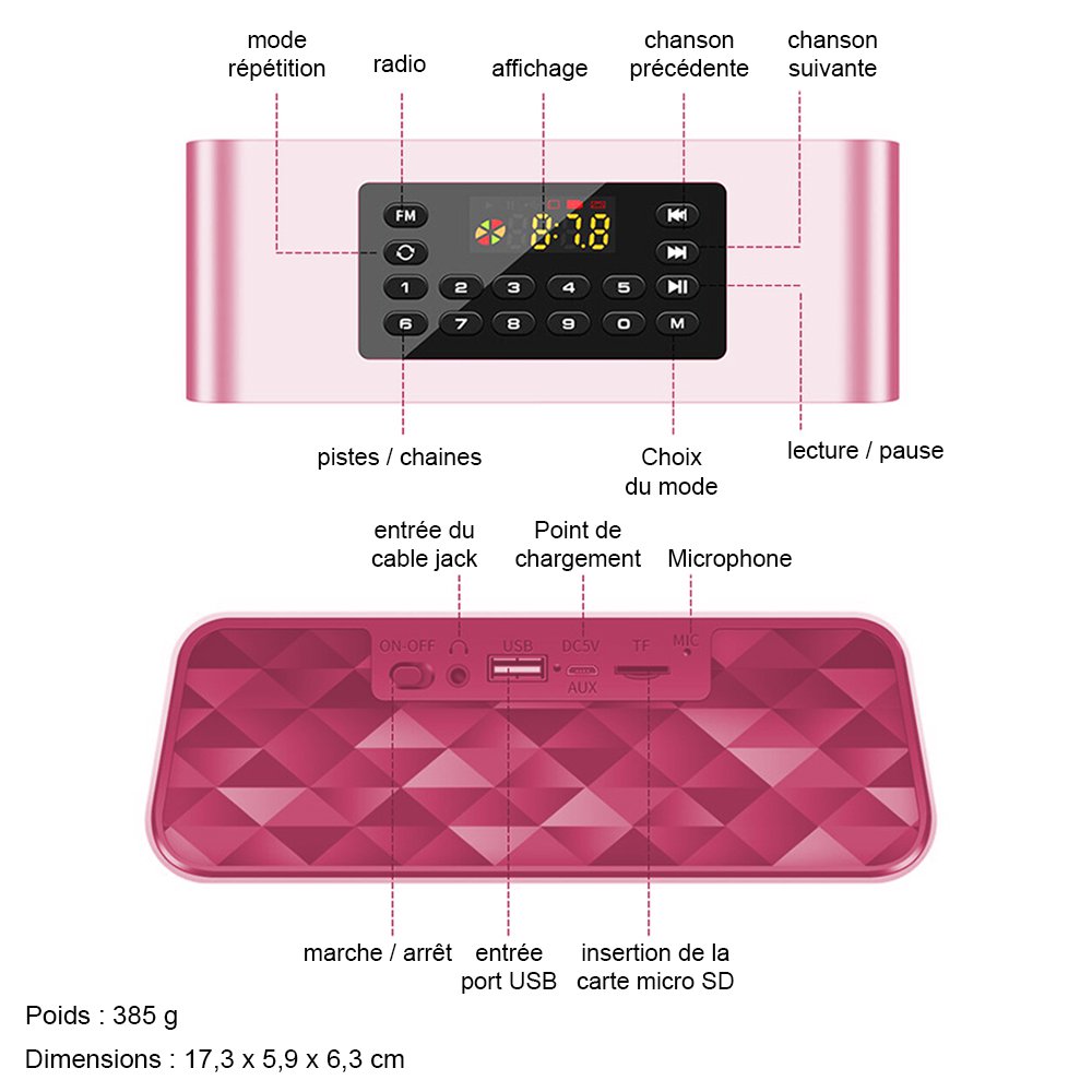 Enceinte bluetooth double haut-parleur stéréo, son de qualité; couvre une large gamme de sons. Système de résonance à Double haut parleurs, 3 unités sonores, jouant une belle symphonie. Le son est clair et beau, les basses sont pleines et lumineuses, comparables à la bande son originale. Batterie au lithium de grande capacité, autonomie de la batterie; microphone à réduction de bruit intégré, réduction de bruit claire, appel mains libres, annonce d'appel vocal, rejet à un bouton. Lecture externe de carte TF/disque U, cartes mémoire de soutien/disque U en dessous de 32 GB, créez votre propre bibliothèque musicaleFaites vous plaisir et écouter votre musique à la maison grâce à cette enceinte design