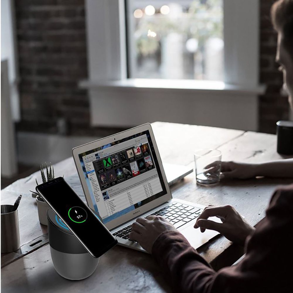 Découvrez la toute dernière enceinte Bluetooth et sa technologie de recharge par induction intégrée.Grâce au support aimanté sur le dessus placer votre téléphone en charge en toute sécurité. Ergonomique, qualité remarquable, et look moderne... cette enceinte Bluetooth s'accorde parfaitement à un lieu de travail ou à des sorties de loisir en plein air. Sa capacité d'autonomie vous permet de recharger à la fois votre smartphone compatible à la recharge par Induction Qi et écouter votre musique avec une bonne puissance de son. La technologie du Bluetooth a également été repensée avec une bonne portée .L'ergonomie est au rendez-vous, compacte, utile, robuste... cette enceinte vous suit parfaitement dans votre lieu de travail ou vos activités de loisir. Parfaite pour ranger dans un sac à dos et transportable partout.