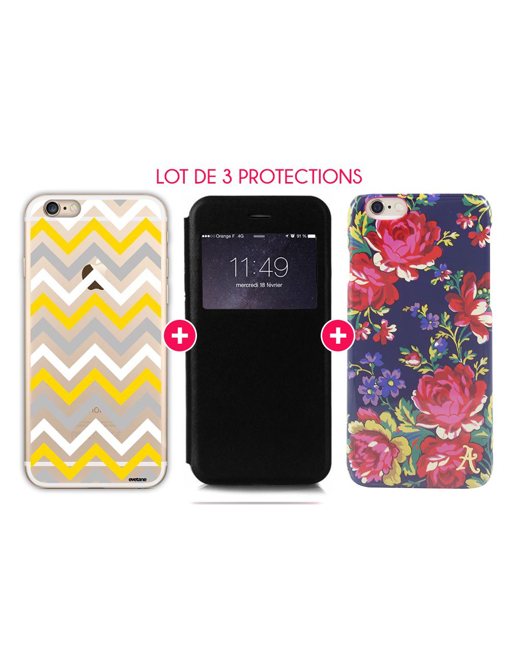 • > High Tech>Etuis>Pack 3 Protections Fashions pour iPhone 6/6S : Coque ZigZag + Etui à rabat avec fenêtre noir +