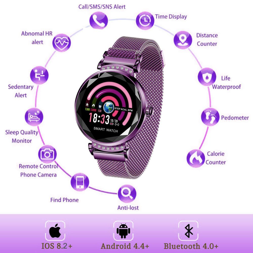 Montre connectée féminine de sport ecran diamantFoction de Moniteur de santé et traqueur d'activité c'est à dire une surveillance de la fréquence cardiaque sur 24 heures, de la pression artérielle, de la qualité du sommeil (durée du sommeil, qualité du sommeil, jour et nuit) ;Mode multisports (course, marche, vélo, randonnée, basketball, football, badminton, etc.) ; podomètre, calories, rappels sédentaires, etc. Téléchargez une application appelée WearHealth pour enregistrer et synchroniser vos données afin d'atteindre vos objectifs de santéFitness Tracker vibre pour vous alerter si votre téléphone reçoit un appel téléphonique, un SMS, Facebook, WhatsApp, Skype, SNS, etc. En même temps, la montre intelligente affiche également du texte afin que vous puissiez le lire directement. Ne vous inquiétez pas de rater des informations importantes.Prévision intelligente : période physiologique, rappel intelligent de période en toute sécurité, à tout moment, n'importe où, vous donner des soins méticuleux, prévision intelligente du jour de l'ovulation, intime précis, le processus de la grossesse est sous contrôle. Montre connectée féminin et IP67 imperméable: Cette montre avec écran TFT couleur de 1,04 pouce et bracelet en acier inoxydable de couleur; Indice de protection IP67, le moniteur de fitness est totalement étanche à la poussière et à l'eau, comme se laver les mains, marcher sous la pluie, etc.Cette montre intelligente pour femme est compatible avec la plupart des smartphones et prend en charge Bluetooth 4.0 ci-dessus, Android4.4 et ultérieur, IOS8.0 et ultérieur.