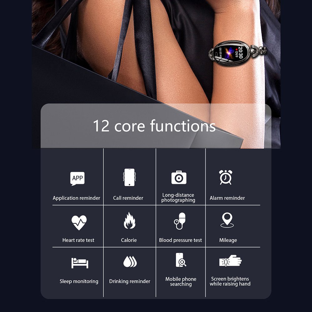 Montre connectée féminine avec pression artérielle - ArgentCette montre équipée d'un écran tactile coloré de 0,96 pouces, d'une bande en acier inoxydable allié décoré de strass bling. Mince et élégant pour compléter un poignet mince qui vous fait paraître à la mode et brillant. Connectez le bracelet connecté au téléphone mobile via l'APP, et configurez les autres fonctions de l'APP. Vous trouverez la polyvalence de ce bracelet intelligent, comme les rappels SMS et appels, les notifications d'applications, les caméras distantes, le réveil, les réglages du style de l'interface principale, le réglage sédentaire, etc. Donnez-vous une vie et un travail plus commodes.La montre de fitness avec moniteur de fréquence cardiaque et moniteur de pression artérielle 24h / 24, enregistre toutes les activités de la journée comme les pas, la distance parcourue, les calories brûlées et la qualité du sommeil. Autres fonctions: mode sport, météo, rappel sédentaire, alerte anti-perte, etc. Une analyse complète des données fournit des données plus raisonnables pour votre plan de santé.Ce moniteur d'activité est doté d'un niveau d'étanchéité à l'eau et à la poussière IP67. Il n'est pas nécessaire de l'enlever quand il pleut, quand on se lave les mains au quotidien. Remarque: ne portez pas pendant que vous prenez un bain.Après une charge complète, la montre peut rester pendant 12 à 15 jours. Pour une utilisation normale, il peut être utilisé pendant 5-7 jours.
