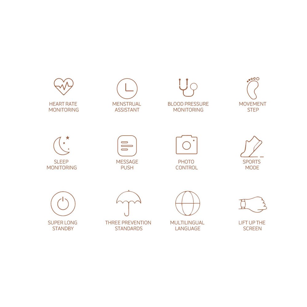 Montre connectée féminine IP68 avec tracker de sommeil - ecrand diamant OrL'écran couleur LCD de 1,04 pouce offre une excellente qualité d'image HD. Vous pouvez régler 6 niveaux de luminosité de l'écran pour répondre à vos besoins en matière de luminosité jour et nuit. 3 thèmes peuvent être choisis sur le bracelet intelligent.La montre dispose de plusieurs fontions tel que l'affichage de la date et de l'heure 12/24, fréquence cardiaque, moniteur de veille, podomètre automatique, réveil, mode multisports, notifications, rappel de sédentarité, commande de caméra à distance, alerte anti-perte, recherche de téléphone, rappel des appels entrants et SMS, rappel des messages , Contrôle de la musique, etc. 15 jours de veille, 5 à 7 jours d'utilisation.Le suivi automatique et continu de la fréquence cardiaque vous aide à mieux comprendre votre santé et votre forme physique. Il suit automatiquement la durée et la cohérence de votre sommeil grâce à une analyse complète des données de qualité du sommeil. Enregistrez avec précision les activités 24/7. Suit vos pas, les calories brûlées, les kilomètres parcourus et les minutes actives de la journée.La montre vous rappelle les messages et les appels avec le message et l'ID de l'appelant affichés sur l'écran du suivi afin que vous ne manquiez jamais d'appels et de messages lors de réunions, de sports ou au travail.La montre et votre application téléphonique sont liées par Bluetooth , Synchronisez votre santé, les données de surveillance de l'exercice, les infos de synchronisation (SMS / Skype / Facebook / Twitter / Line / WhatsApp / QQ / WeChat). Compatible avec IOS 8.2 et versions ultérieures et Android 4.4 et versions ultérieures des smartphones.