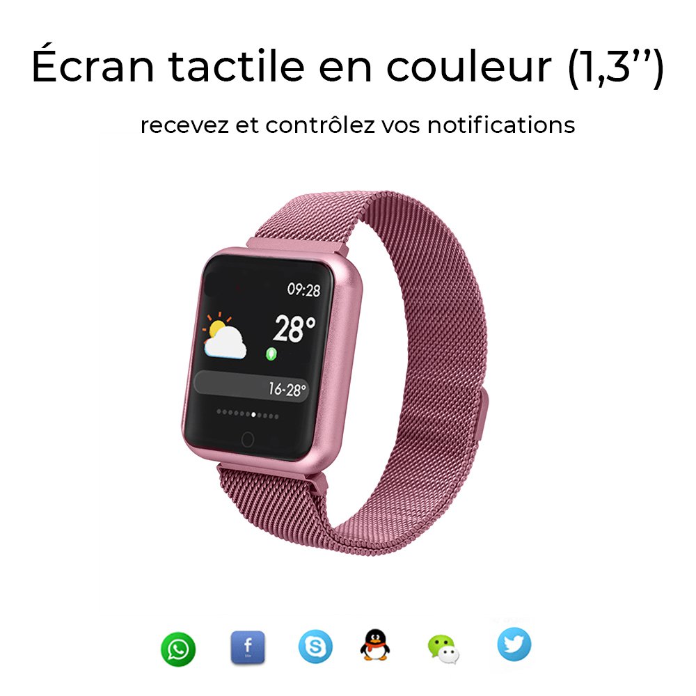 • Montre connectée multi-sport IP67 avec bracelet modifiable (silicone ou métallisé) Rose Gold
