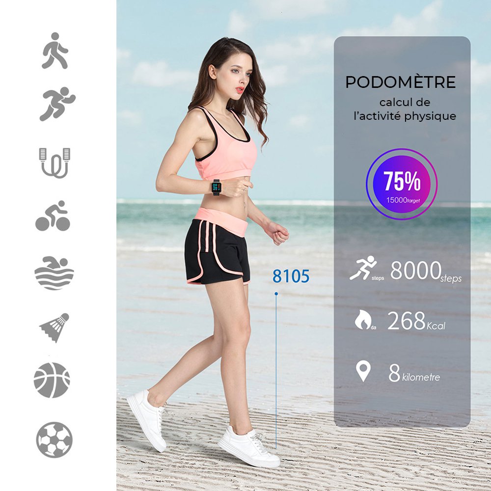 Montre connectée IP68 avec fréquence cardiaque, étanche, multisportCaractéristiquesPlusieurs mesures au niveau d'une activité sportive tel que l'étape, le temps d'exercice,le kilométrage, la consommation de calories, la surveillance du sommeil,Surveillance de la santé: Mesure de la fréquence cardiaque en temps réel (mesure de la fréquence cardiaque toute la journée), mesure de la pression artérielle, mesure de l'oxygène dans le sangRappel intelligent: Rappel d'alarme personnalisé, rappel sédentaire, rappel d'appel, rappel d'information/ notificationAutres fonctions: Sélection du cadran, mode multi-sport (8 types de modes de sport tels que la marche, le badminton), affichage du poignet, affichage de la météo, affichage de l'heure, photographie à distance, musique à distance, ne pas déranger le réglage du mode, trouver le bracelet, WeChat sports, le bracelet refuse de répondre au téléphone et prend en charge la mise à niveau de l'application air. Caractéristiques du matériel:Taille : 39.9*34*10.2,Poids: 106.1g, Puce principale: NRF52832 QFAA, Capteur d'accélération: BOSCH BMA 421,Type de Bluetooth: Bluetooth 4.0 mode de bouton: écran tactile uniqueCaractéristiques d'affichage: résolution d'écran couleur IPS 1.3 pouces 240*240 Type de batterie: Batterie au Lithium polymère 200 mAh,Tension de charge: 5.0 V,Courant de charge: 75MAVeille 10 à 15 jours,Utilisation normale 6 à 8 joursFréquence cardiaque dynamique/tension artérielle: supportMéthode de charge: interface magnétique la charge en ligne se connecte au port USB.Type de poussée de police: police multilingue Application de Support: Da FitExigences du système de téléphone portable: prend en charge Android 4.4 et plus, Apple IOS 9.0 ou plus