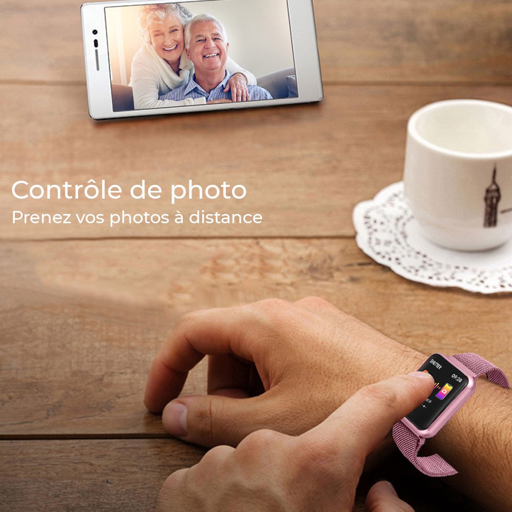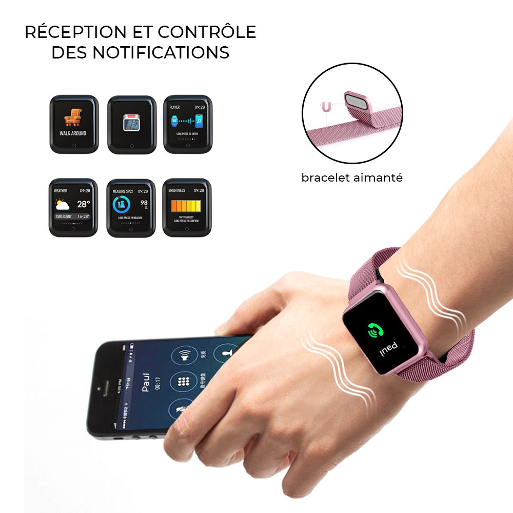 • Montre connectée avec suivi d'activités compatible iOs et Android - avec bracelet en metal Rose Gold