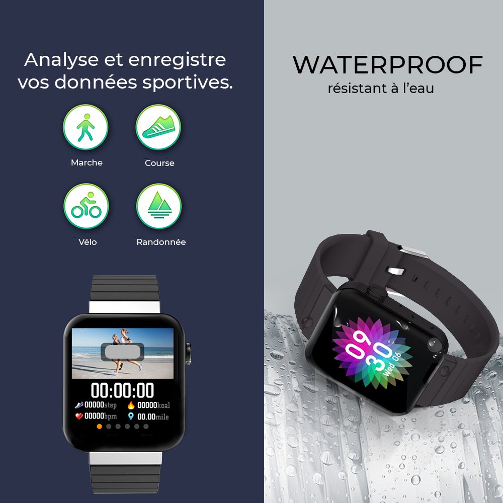 • Montre connectée multi-sport IP67 avec bracelet modifiable (silicone ou métallisé) Noir
