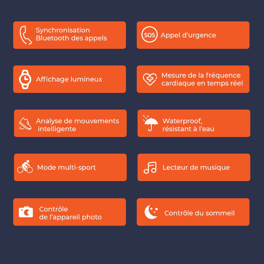 Montre connectée IP67 avec moniteur de fréquence cardiaque,multisport,contrôle de la musiqueFonctions : notification appel grâce au Bluetooth / surveillance de l'activité sportive/ surveillance de la fréquence cardiaque / rappel intelligentCaractéristiquesAppel téléphonique et synchronisation Bluetooth : grâce au haut-parleur intégré et au Bluetooth répondez rapidement à vos appelsappel SOS d'urgence : synchroniser les contacts du téléphone et définir comme appel SOS, Numérotation rapide en cas d'urgenceSupporte un affichage long et lumineux : Choix parmi différents horaires de styleMesure de la fréquence cardiaque en temps réel : Surveillance de la fréquence cardiaque en temps réel à tout moment, Calculez intelligemment les données de pression artérielle et d'oxygène et enregistrez-les dans l'applicationRegardez votre fréquence cardiaque changer / capteur de fréquence cardiaque au poignet /Surveillez votre fréquence cardiaque la veille en temps réel pendant l'exercice.Une mesure de la pression artérielle / oxygène sanguinAnalyse de mouvement intelligente dans ReachIP67 étancheMode multisports : Prise en charge de sports tel que course / marche / escalade / cyclisme . Surveillance, analyse et enregistrement personnels en temps réel. Faites connaître à tout moment les résultats des sports, améliorez l'effet d'entraînement scientifique.Rendez un entraînement plus efficace que ce soit dans la salle de sport ou à l'extérieur Contrôle/Surveillance du sommeil: Démarrez automatiquement la surveillance la nuit, surveillance et analyse intelligente de la qualité du sommeil. Charge magnétique Configuration de charge par aspiration magnétique forte endurance Absorption magnétique automatique Lecture de musique Synchronisée : Connectez votre téléphone pour écouter de la musique en déplacement Rendez l'exercice plus agréableControle de l'appareil photo, caméra : Sports / voyages et autres activités de plein air pour vous aider à prendre des photosSurveillance du sommeilBouton multifonctionsIP67 étanche Conception de structure de précision étanche Imperméable à l'usure quotidienneAppel téléphonique Bluetooth Synchronisé mains libres partout