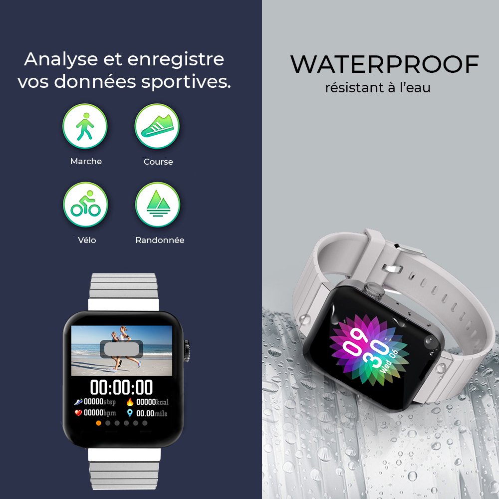 • Montre connectée multi-sport IP67 avec bracelet modifiable (silicone ou métallisé) Noir