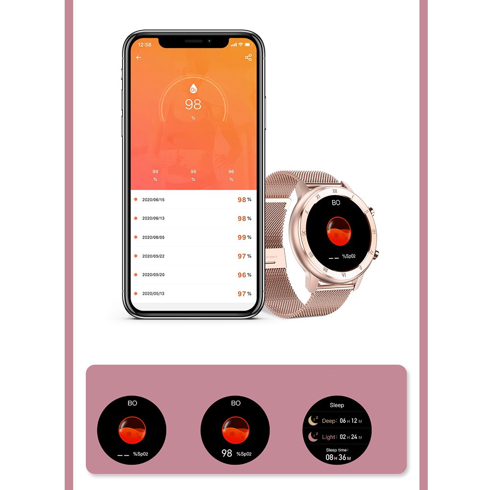 • Montre connectée IP68 avec mesure de pression artérielle et suivi du sommeil rose gold avec bracelet en métal