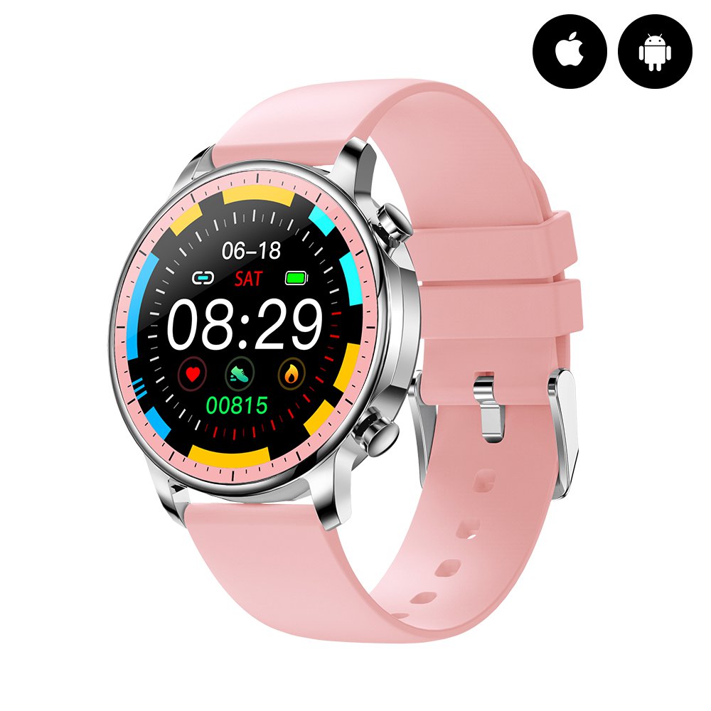 Montre connectée fitness iP67 avec mesure de la pression artérielle - Rose Grâce à cette montre vous pouvez surveiller vos données d'activité sportive, de santé...... Vous pouvez synchroniser via le Bluetooth avec l'application sur votre smartphone et profitez de ses nombreuses fonctionnalités telles que la fonction podomètre qui vous indiquera la distance parcourue et les calories consommées tout au long de la journée. L'application vous permet de vous donner des objectifs et de recevoir des notifications une fois que vous les avez atteints. Vous pouvez également suivre votre historique par jours / semaines / mois de votre activité physique.Fonctions principales - la synchronisation de la montre avec votre téléphone permet d'afficher la date et l'heure.- Rappels et notifications configuration à partir de l'application, vous recevrez des notifications des applications de messagerie et d'appel.- Mode de sédentarité : vous permet de configurer la fréquence des notifications pour manque d'activité.- Surveillance de la qualité du sommeil : évaluez la qualité de vos périodes de repos.- Chronomètre.- Alarme intelligente : vous permet de configurer plusieurs alarmes.- Déclenchement de l'appareil photo: contrôlez l'appareil photo de votre smartphone et prenez des photos avec un geste sur votre appareil.- Chargement : connectez le câble de chargeur inclus à un port USB ou à un chargeur compatible.- Podomètre :compte et affiche le nombre de pas, la consommation de calories, la distance parcourue et vous pouvez définir un objectif d'exercice quotidien.- Mesure de la fréquence cardiaque.- Mesure de la pression artérielle.Caractéristiques Principales:Rappel d'appel push, rappel SMS, poussée de rappel WeChat, enregistrement d'exercice (compte de pas, kilométrage, etc.), surveillance du sommeil, rappel sédentairité, calcul de calories, chronomètre, rappel de batterie faible, lever la main pour illuminer l'écran, Charge rapide, consommation d'énergie ultra-faible, fréquence cardiaque, pression artérielle, vibration, mode d'exercice, caméra à distance, contrôle de la musique, alarme intelligente, prévisions météorologiques, fréquence cardiaque dynamique. Grand écran haute définition, commutation multi-cadran, sports Caractéristiques- Application DaFit- Version Bluetooth 5.0.- Compatible avec Android 4.0, iOS 9.0 et plus.- Capacité de la batterie - 170 mAh.- Écran IPS TFT 1.3 pouces.- Résolution - 240 x 240 px.- Waterproof - IP67.