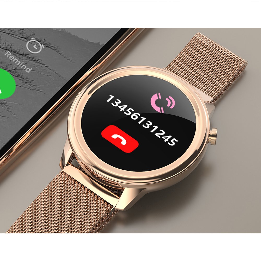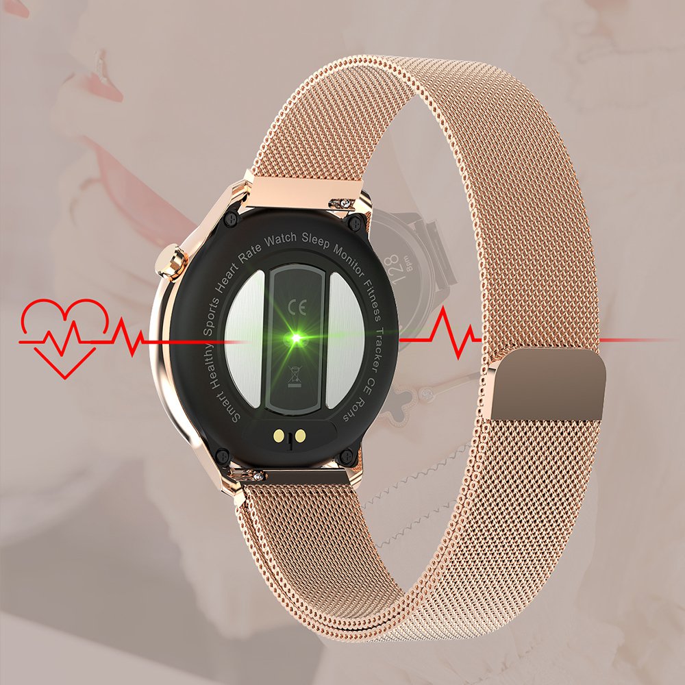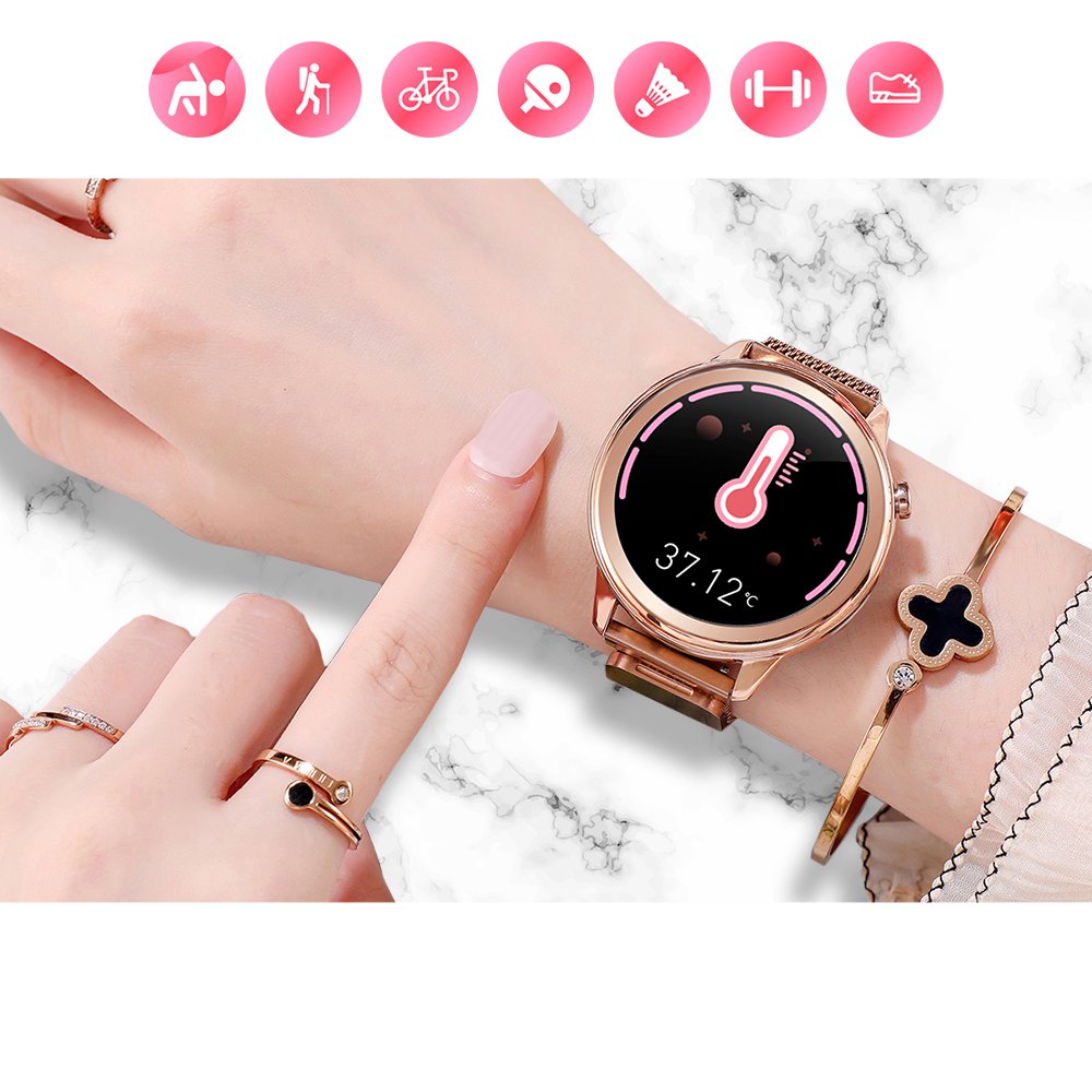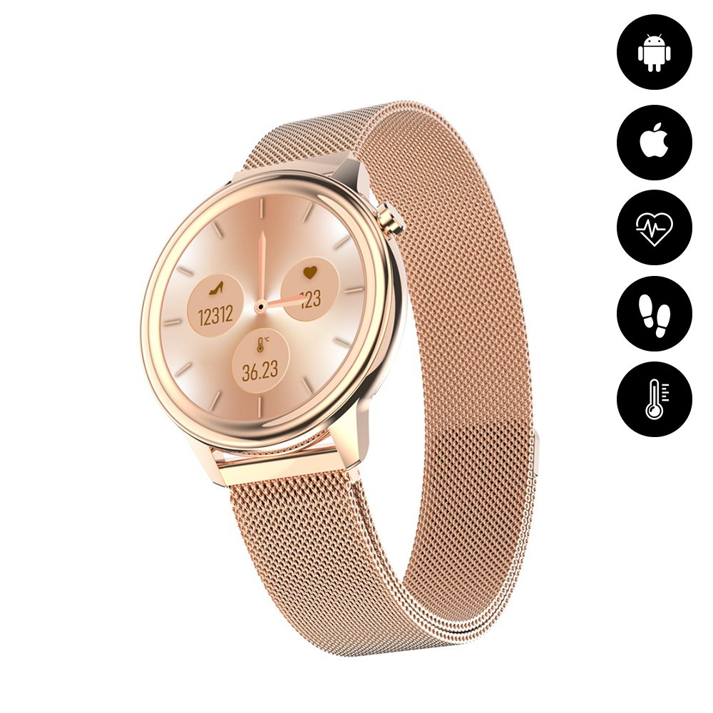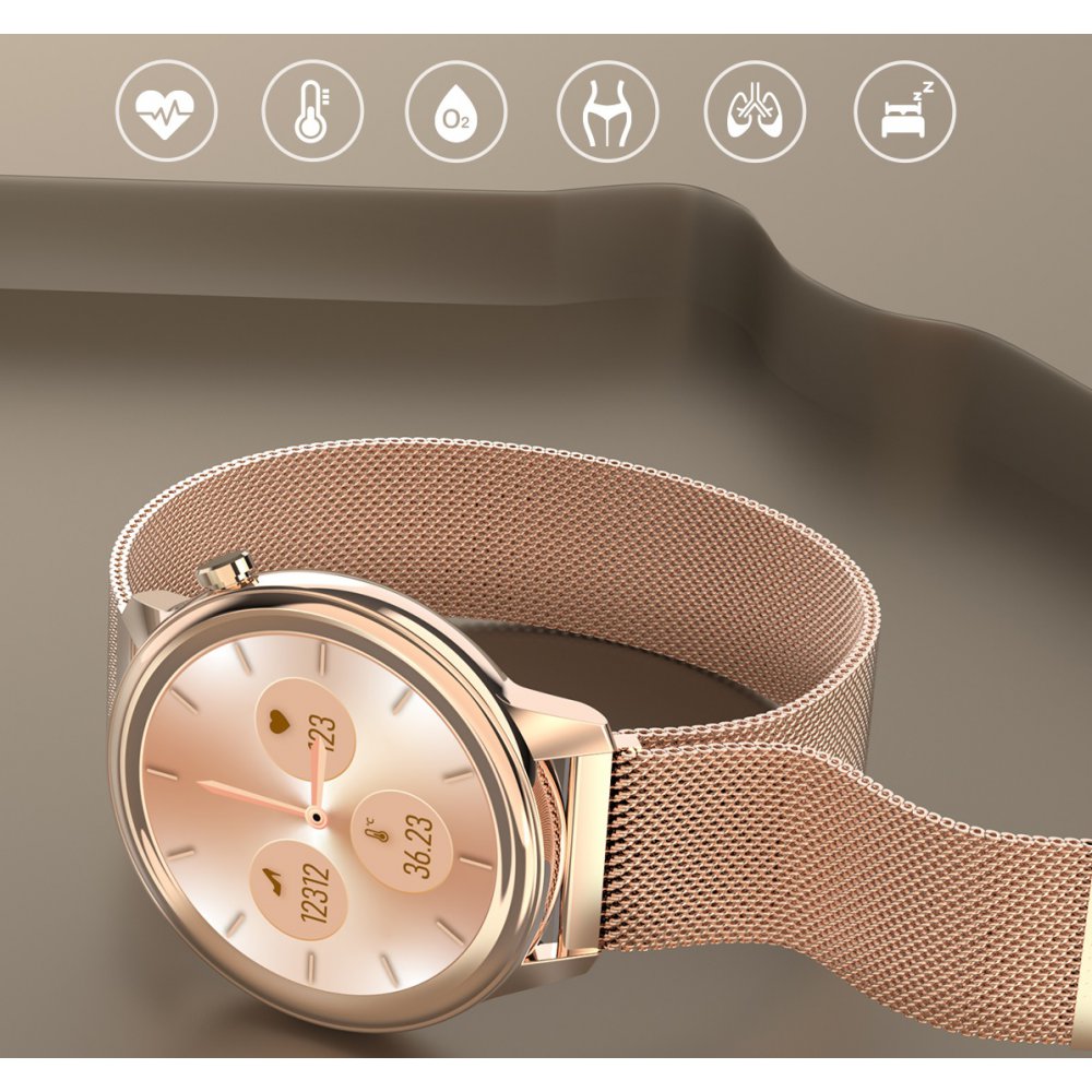 Montre connectée IP68 suivi d'activité, podomètre - bracelet métal ORLa montre dispose de nombreuses caractéristiques et fonctions. En effet vous avez la possibilité de choisir entre plusieurs fond d'écran pour votre cadran, mesure de la pression sanguine ou de votre oxygénation dans le sang, mesure de votre rythme cardiaque, suivi de votre cycle féminin, surveillance du sommeilLa montre vous permet de prendre la température corporelle mais également la pression sanguine, votre oxygénration, rappel de sédentarité... Vous avez la possibilité de choisir votre cadran parmi un large choix.Grâce à la fonction de surveillance, vous avez la possibilité d'avoir un oeil sur votre cycle et dans quelle période du cyle vous vous trouvez afin d'avoir un rappel.... La montre vous permet d'enregistrer différentes données lors d'activité physique tel que la marche, le vélo, le badminton.... Grâce à la montre vous pouvez recevoir vos notifications, vos appels.... Suivi du sommeil avec l'enregistrement des phases du sommeil.... Contrôle de musique à distance, lors de votre activité physique vous pouvez gérer la musique directement depuis votre montre.L'indice IP68 inidque que la montre résiste aux éclaboussures d'eau ou à la pluie par exempleInformations Sur le produit:Distance de transmission Bluetooth: 8 ~ 10 mètresNiveau imperméable à l'eau: IP68Matériau du corps: alliage métal + PC + ABSMatière du bracelet: milanais en or, GraphiteTaille de l'écran (pouces): 1.3 Résolution: 240*240 dpiÉcran tactile: 1.3 pouces capacitif pleine toucheCapacité de la batterie: polymère Li-ion 200 mAhAutonomie utilisation normale: environ 7 joursAutonomie en veille : environ 20 joursManière de charge: Absorption magnétiqueTemps de charge: 3 ~ 4 heuresCompatibilité: BLE V4.2, iOS 8.2 ou version ultérieure, Android 4.4 ou version ultérieure.Modes de contrôle: contrôle tactile plein écran, contrôle App