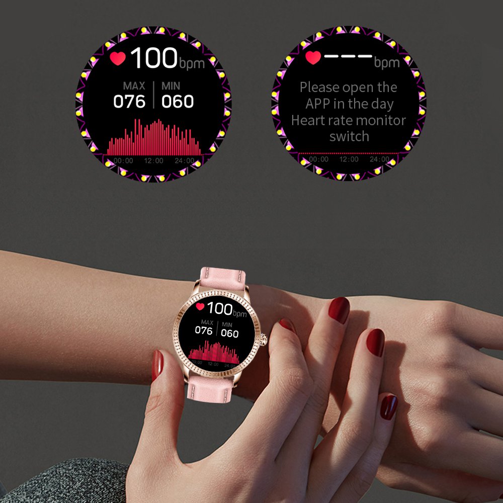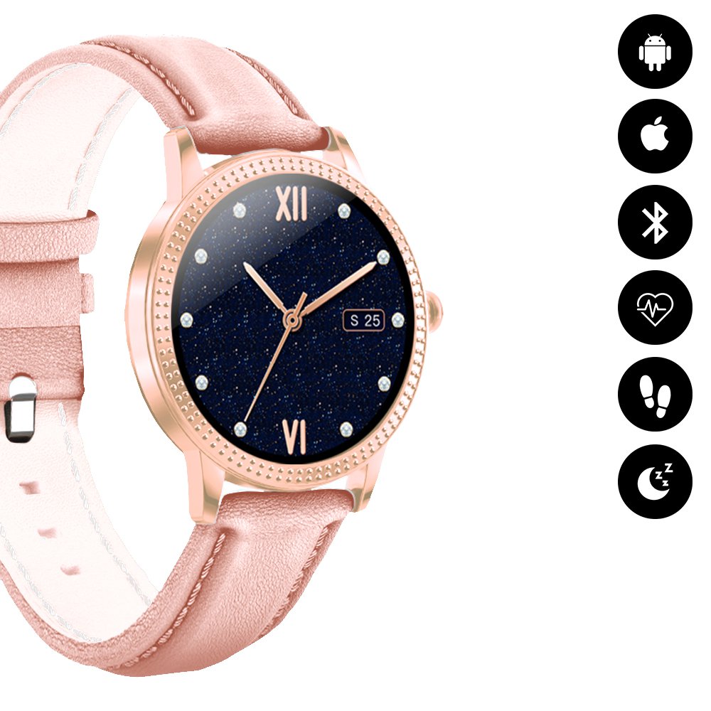 Montre connectée Bluetooth avec moniteur de fréquence cardiaque, suivi d'activité sportive - RoseEn plus de pouvois suivre votre activité physique la montre vous permet de mesurer votre fréquence cardiaque, le nombre de pas effectués, la qualité de votre sommeil, la distance parcourue et les calories brûléesVous pouvez également recevoir des notifications (SMS, WhatsApp... ) depuis votre Smartphone et synchroniser vos données d’activité et de sommeilVous pouvez définir un objectif de pas quotidien et ainsi être averti lorsque celui-ci est atteint.L’application vous permet de consulter l’historique par jour/semaine/mois de votre activité physique, ainsi que la qualité de votre sommeil.Vous disposez également d'autres fonctions tel que :- Capteur de fréquence cardiaque- Mesure de la tension artérielle- Contrôle des pas- Contrôle des calories- Contrôle de la distance parcourue- Moniteur de sommeil- Horloge- Notifications : Notifications d’appel entrant, SMS, whatsapp, etc. vous pouvez configurer les notifications depuis l’applicationCaractéristiques techniquesComposition du bracelet : Silicone douxCaractéristiques : Batterie rechargeable Li Polymère : 110 mAh. Écran IPS TFT de 1,22 poucesRésolution : 240 x 240Bluetooth 4.0Distance de fonctionnement : 10 mCompatible avec Android 4.4. et iOS 9.0 ou supérieur