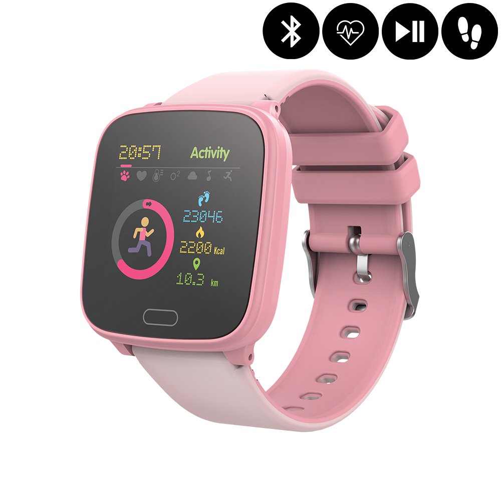 • > High Tech>Objets connectés>Montres>Montre connectée Bluetooth Enfant avec contrôle de la musique,distance parcourue,moniteur fréquence cardiaque - Rose