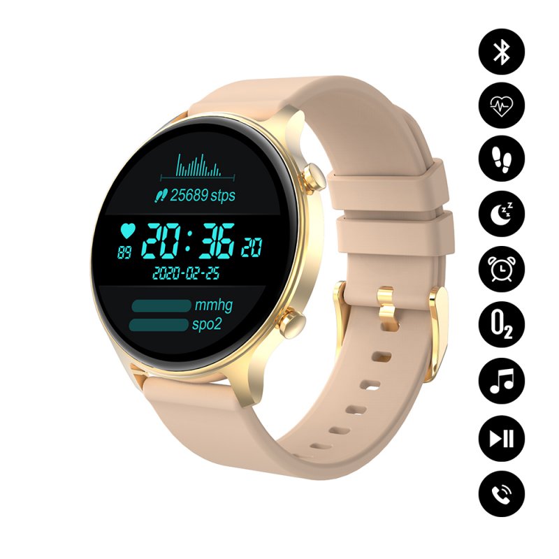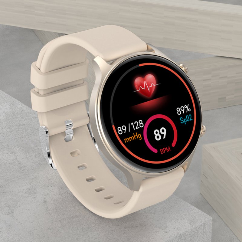 Montre connectée Bluetooth: micro pour appels téléphonique,musique,fréquence cardiaque, pression artérielle, beige