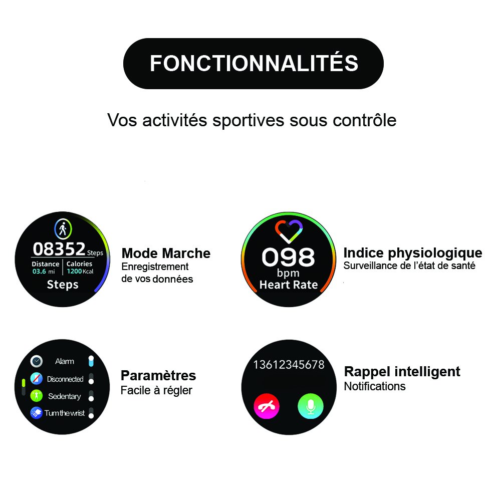 Montre connectée, avec des fonctionnalités techniques au top des tendances , suivi d'activités fonction cardio, suivi du sommeil , notifications SMS et appel ; le smartphone peut être au fond du sac à main vous serez toujours avertis de vos appels ou de vos notifications.Version bluetooth BT 4.0 ou plus. Compatible OS Android 4.4 ou plus, iOS 8.0 ou plus
