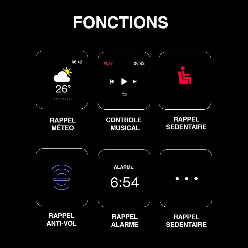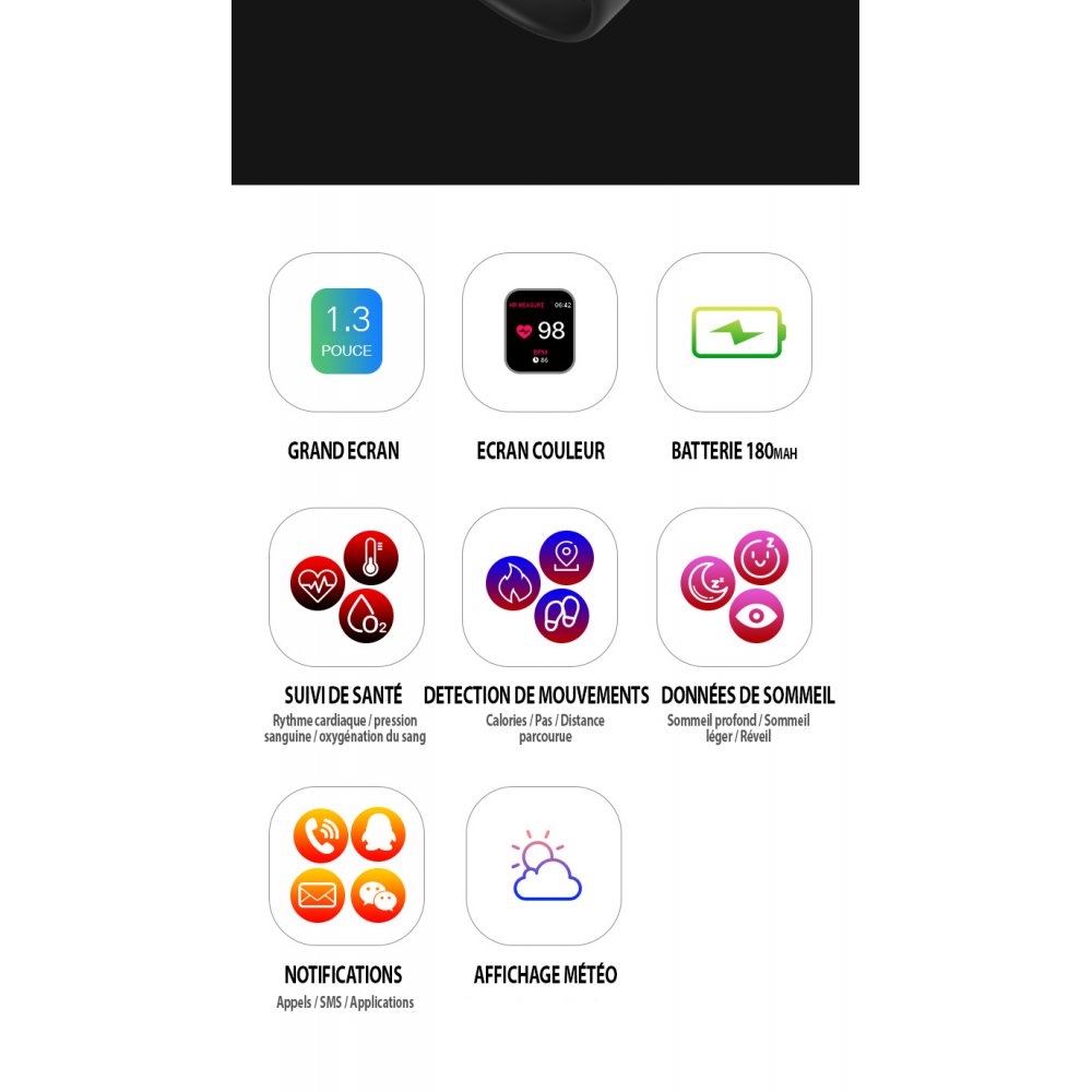 Compatible iOS et Android, son côté design lui touche une large catégorie de clients. La montre dispose d’un bracelet en silicone au fermoir pression et d’un écran IPS 1.3 pouces, avec une résolution de bonne qualité.
