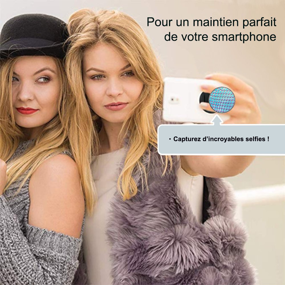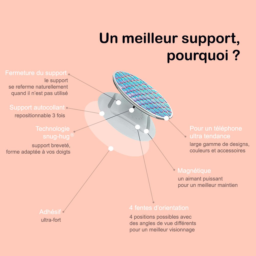Ce support est conçu pour améliorer vos textos, vos tapotements, vos photos, vos conversations, vos tournages et votre expérience téléphonique globale, tout en vous exprimant à travers un design amusant et audacieux.