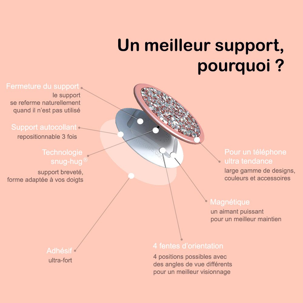Ce support est conçu pour améliorer vos textos, vos tapotements, vos photos, vos conversations, vos tournages et votre expérience téléphonique globale, tout en vous exprimant à travers un design amusant et audacieux.