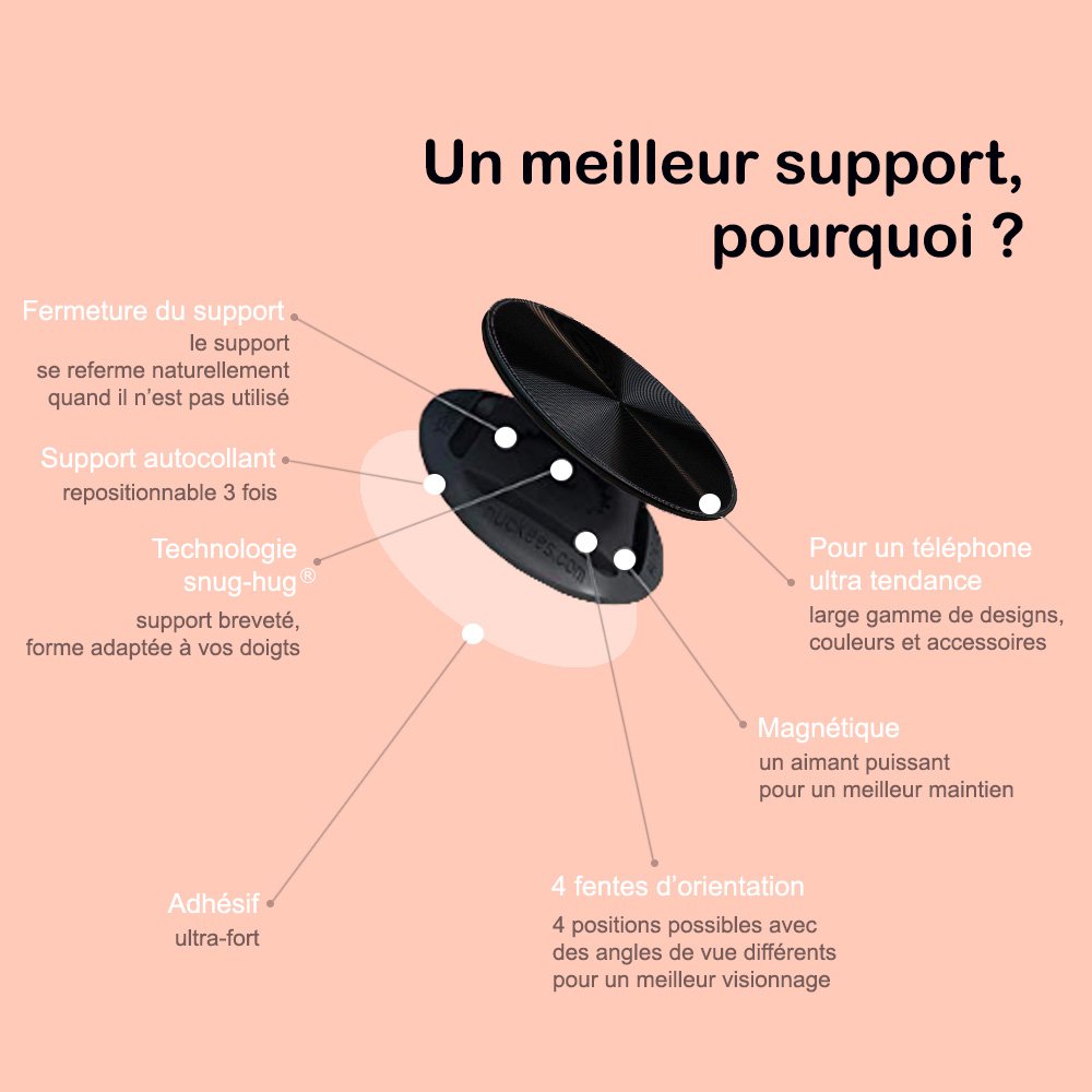 Ce support est conçu pour améliorer vos textos, vos tapotements, vos photos, vos conversations, vos tournages et votre expérience téléphonique globale, tout en vous exprimant à travers un design amusant et audacieux.