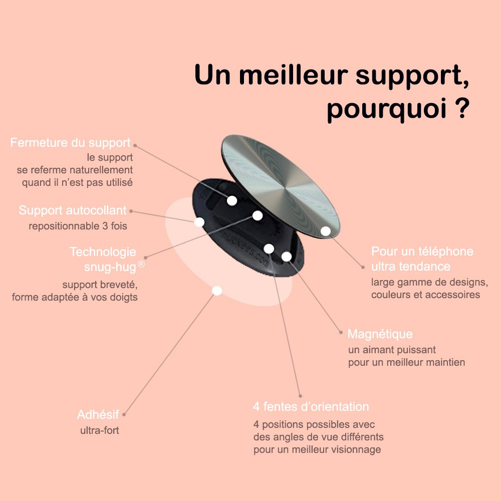 Ce support est conçu pour améliorer vos textos, vos tapotements, vos photos, vos conversations, vos tournages et votre expérience téléphonique globale, tout en vous exprimant à travers un design amusant et audacieux.