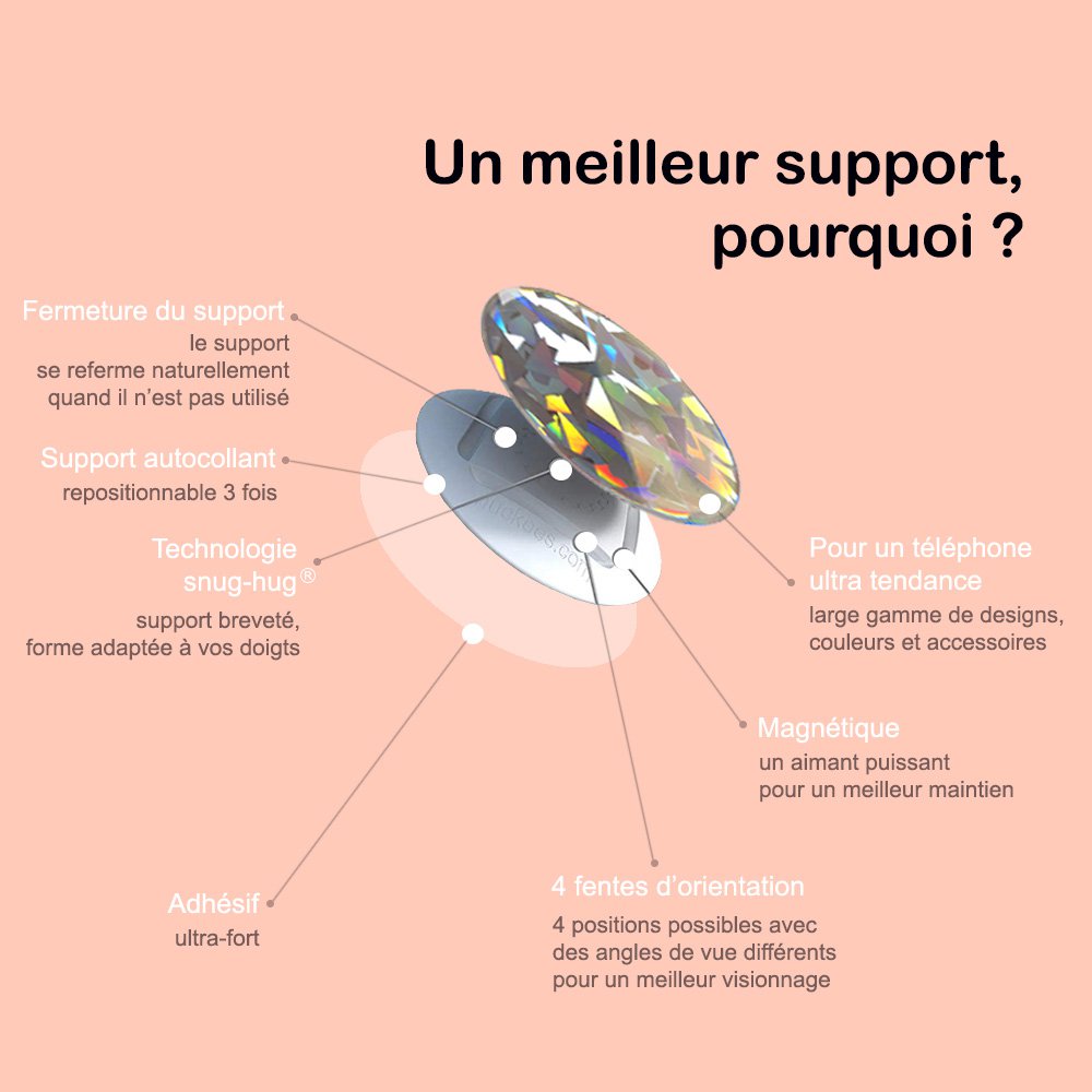 Ce support est conçu pour améliorer vos textos, vos tapotements, vos photos, vos conversations, vos tournages et votre expérience téléphonique globale, tout en vous exprimant à travers un design amusant et audacieux.