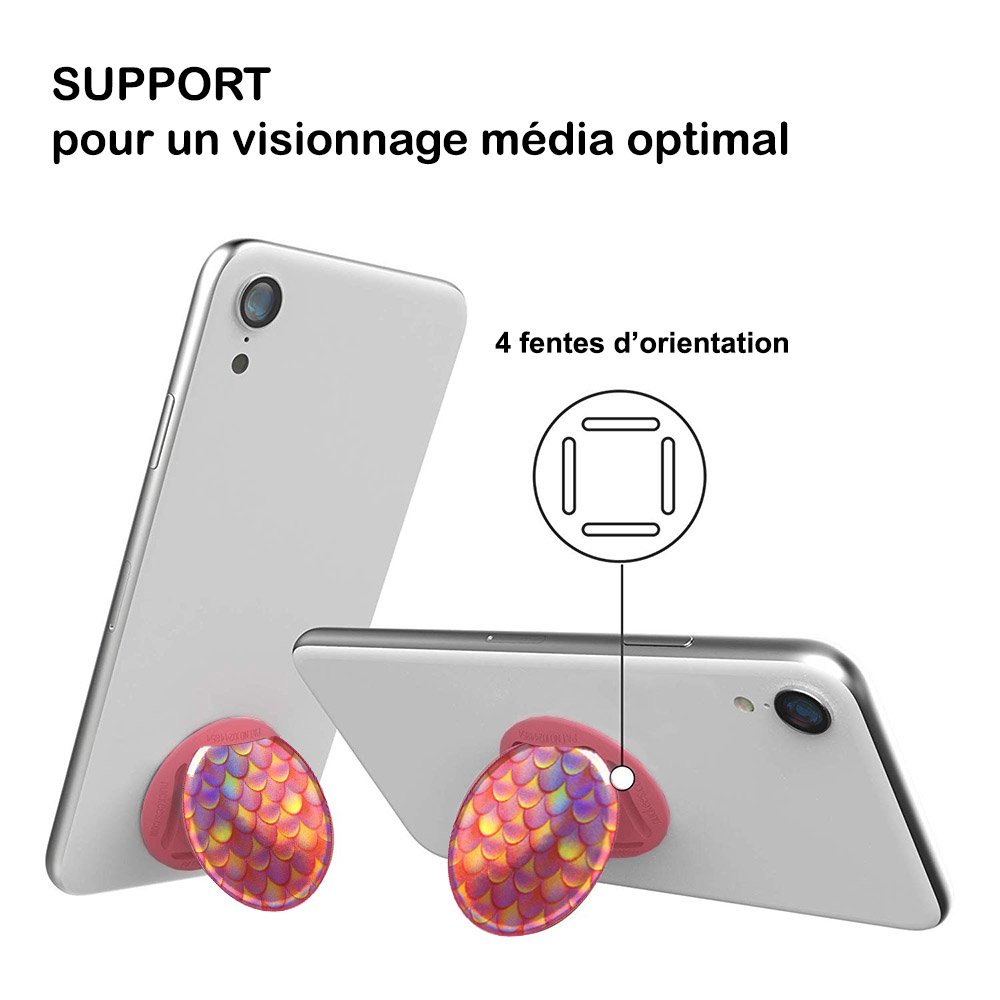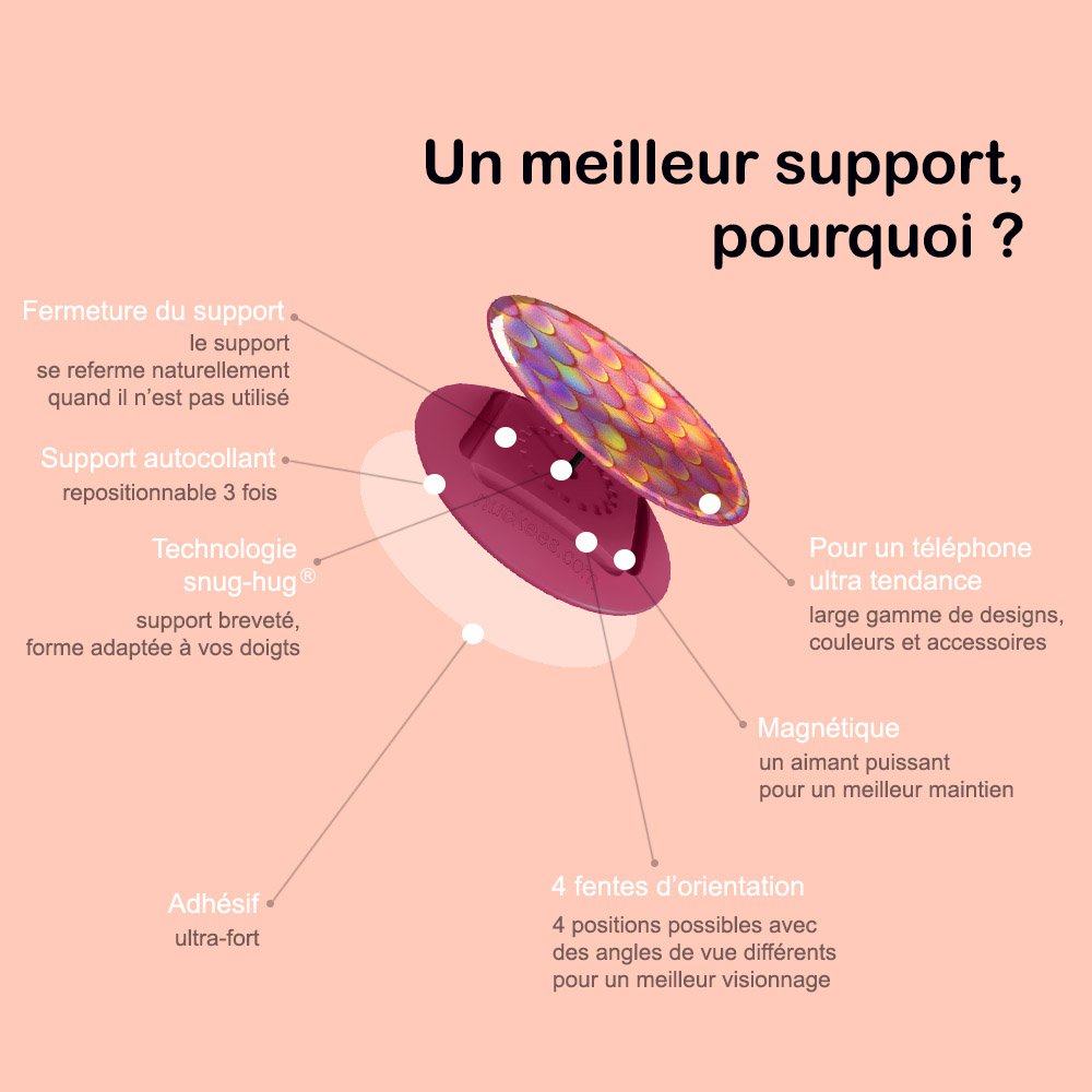 Ce support est conçu pour améliorer vos textos, vos tapotements, vos photos, vos conversations, vos tournages et votre expérience téléphonique globale, tout en vous exprimant à travers un design amusant et audacieux.