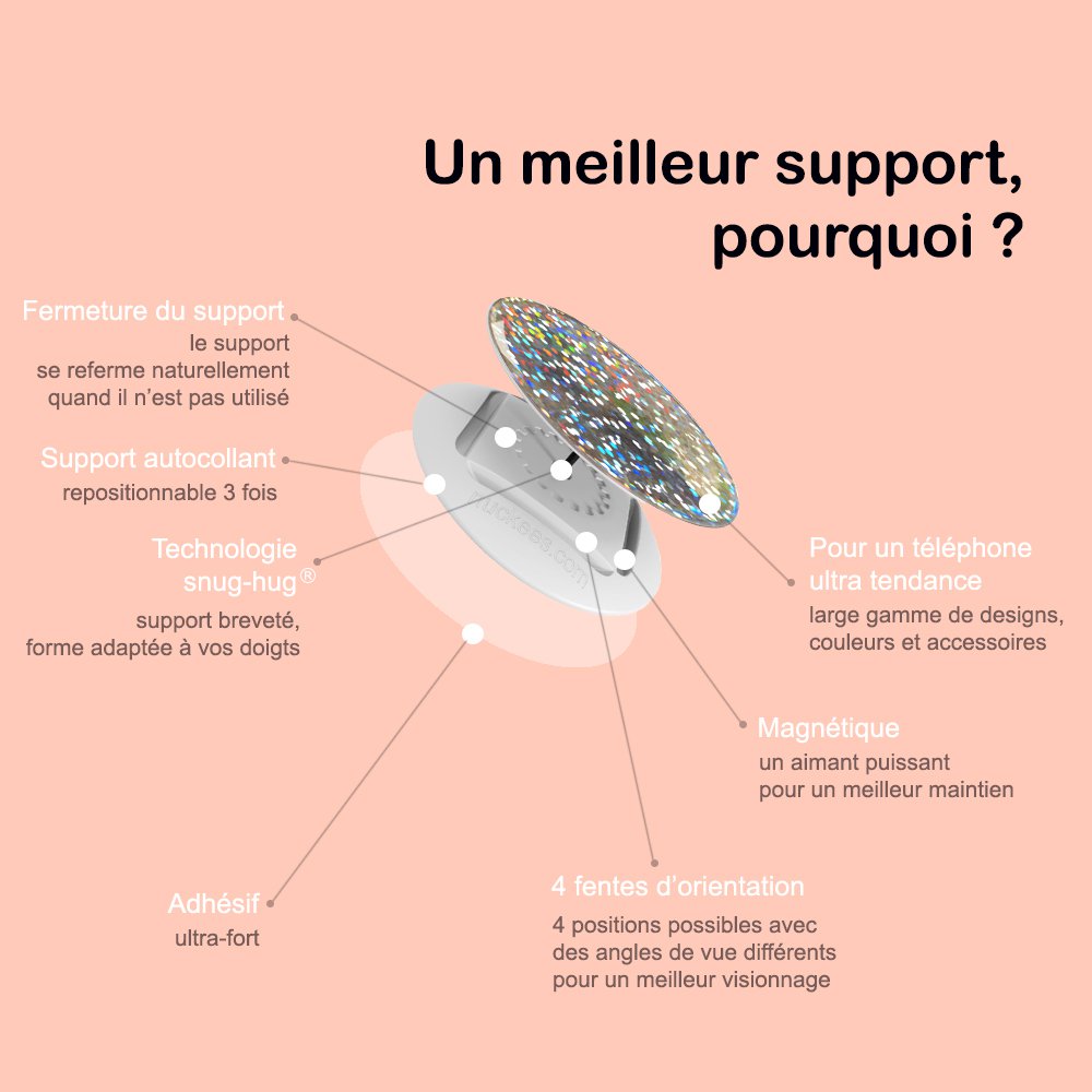 Ce support est conçu pour améliorer vos textos, vos tapotements, vos photos, vos conversations, vos tournages et votre expérience téléphonique globale, tout en vous exprimant à travers un design amusant et audacieux.