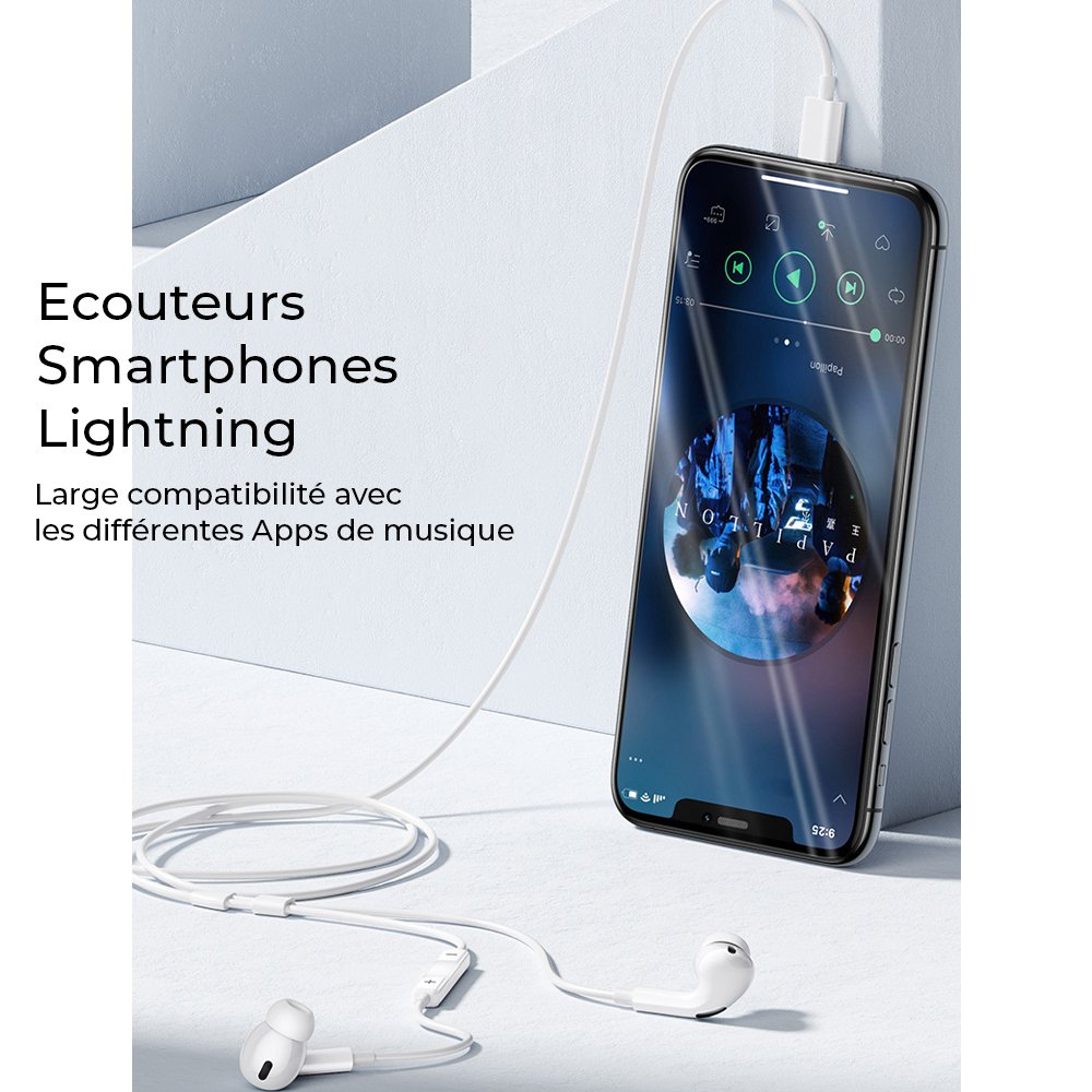 Écouteurs intra-auriculaires avec prise lightning et microphone 1,2 m- blanc Ecouteur avec haute résolution, excellente qualité sonoreContrôle intelligent du fil audio / appel, opération plus pratiqueCâble TPE solide et durableSpécification:Matériel: TPELongueur de câble: 1,2 mSensibilité du haut-parleur: 96 dBDiamètre du haut-parleur: 10 mmImpédance: 16Ωréponse en fréquence: 20 Hz ~ 20 KHzSensibilité du micro: -48 ± 3dBFonction: audio + appelCompatible avec:Smartphones et tablettes Apple avec port lightning