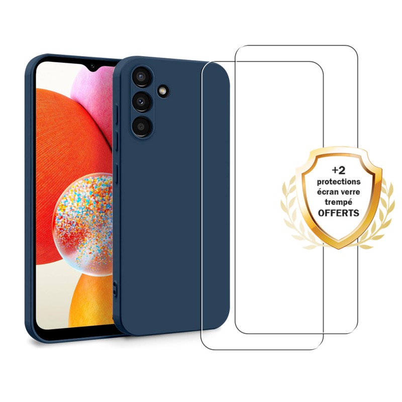 • Coque Samsung Galaxy A14 Silicone liquide Bleue Marine + 2 Vitres en Verre trempé Protection écran Antichocs