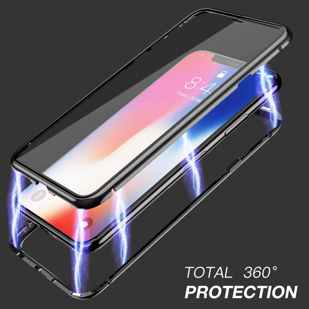Coque 360 intégrale aimanté transparente des deux côtés en verre Trempé qui permet de protéger votre téléphone contre les chutes, chocs, et les rayures.Le contour de la coque est fait d'alliage en aluminium. les 2 parties s'emboitent grâce à la présence des aimants de chaque côté, l'installation est facile. Vous protéger votre téléphone tout en conservant sa couleur et son designe d'origine.Les fonctionnalités telles que les boutons, la caméra et les connectiques restent parfaitement accessibles.La présence du verre trempé pour protégervotre téléphone n'altère pas la sensibilité tactile et le rendu des couleurs de votre écran.