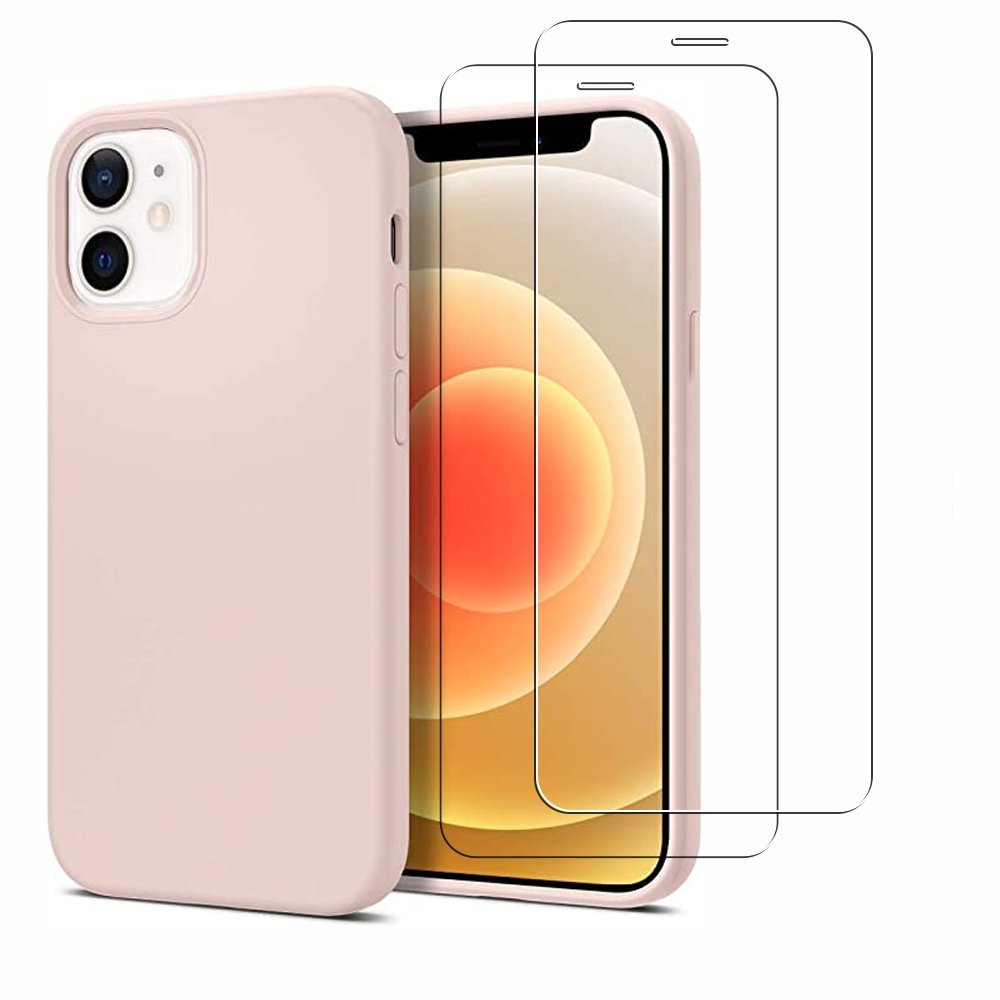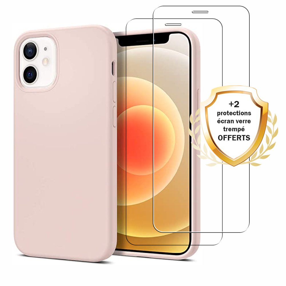 •  Coque iPhone 12 Mini Silicone liquide Rose + 2 Vitres en Verre trempé Protection écran Antichocs