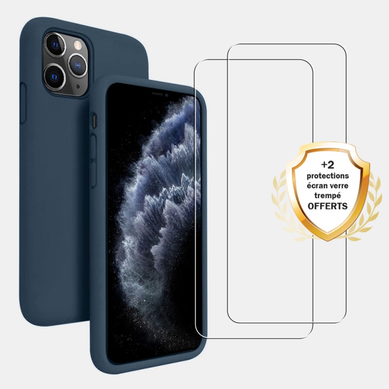 • > Coques>Coque iPhone 11 Pro Max Silicone liquide Bleu Marine + 2 Vitres en Verre trempé Protection écran Antichocs