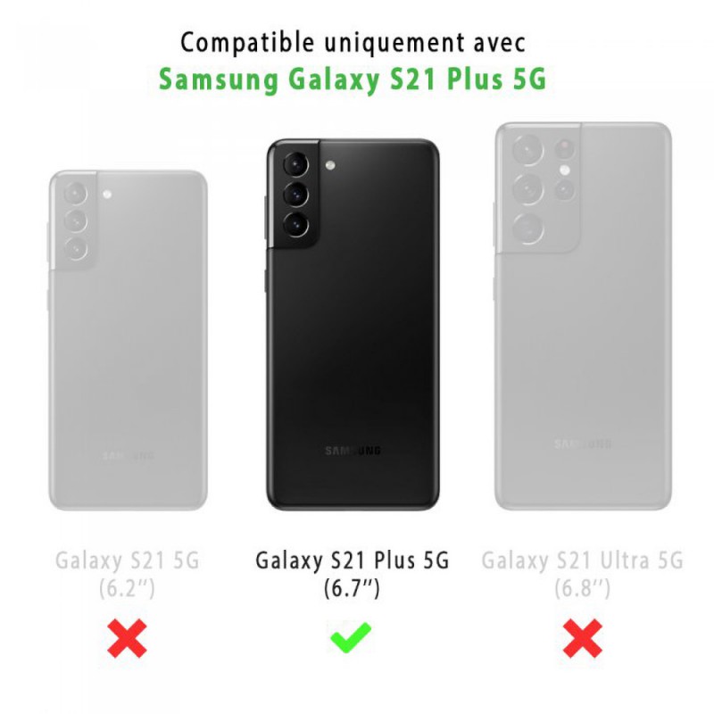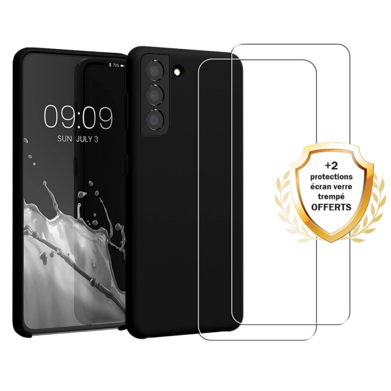 Pack coque anti-choc silicone liquide noire + 2 verres trempés, offrant une protection intégrale compatible avec votre Galaxy S21 Plus contre les chocs, les rayures et la poussière. Kit de nettoyage et d'installation inclus