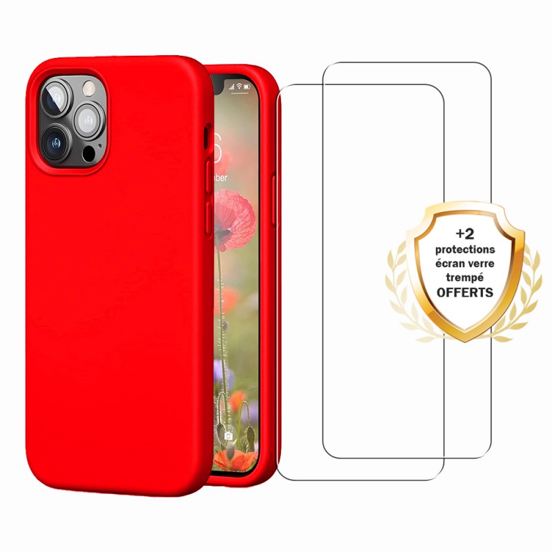 • > Coques>Coque iPhone 12/12 Pro Silicone liquide Rouge + 2 Vitres en Verre trempé Protection écran Antichocs