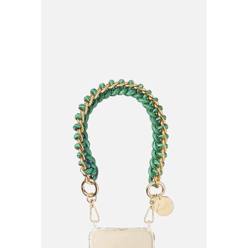 • Bijoux de téléphone Romy avec mousquetons dorés 40 cm cordon tressé vert avec chaîne en metal