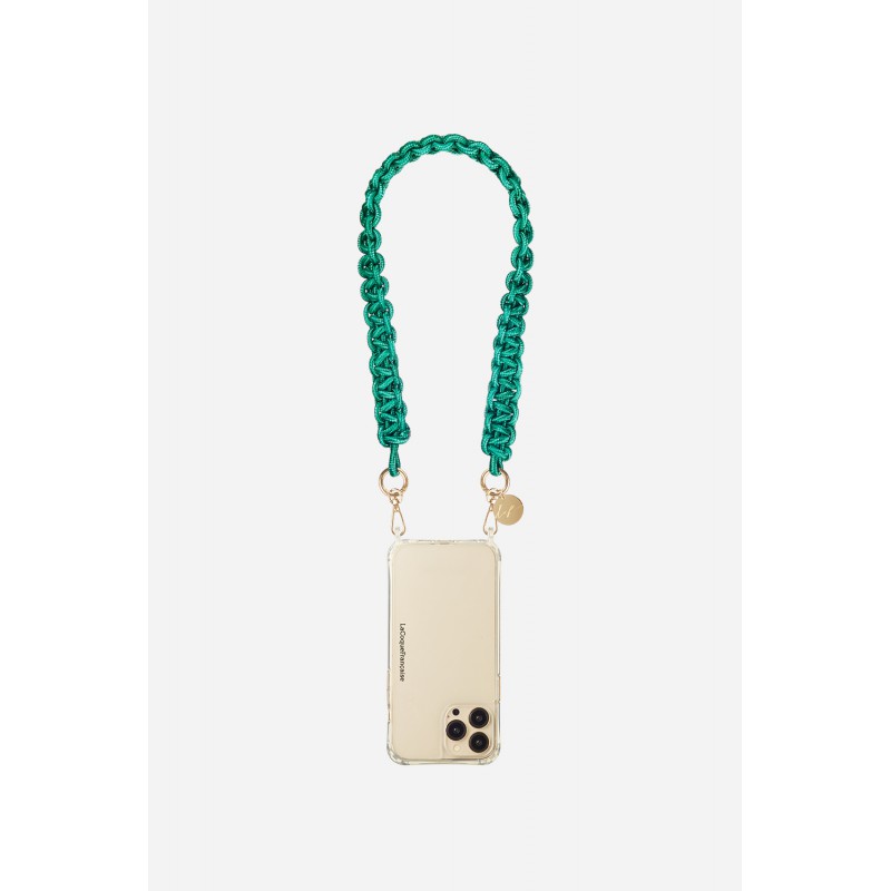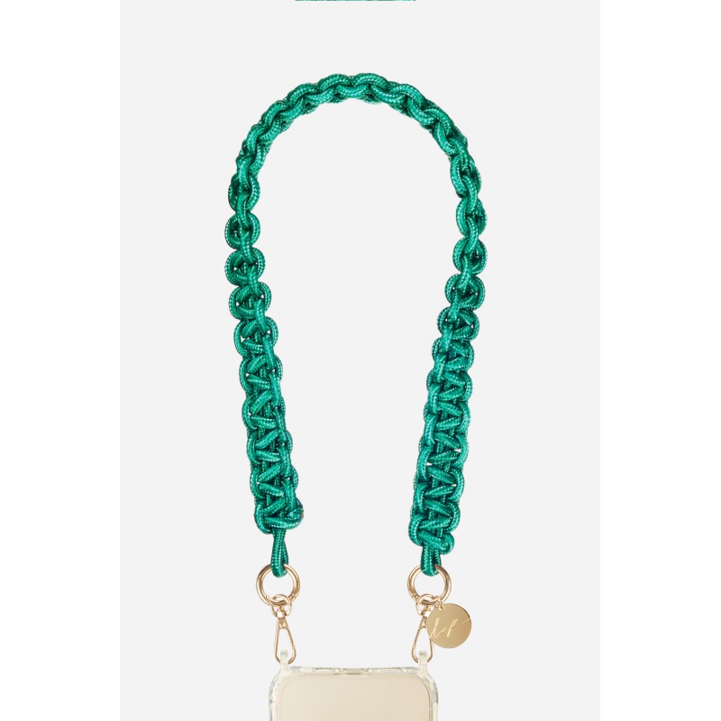 • Bijoux de téléphone Romy avec mousquetons dorés 40 cm cordon tressé vert avec chaîne en metal