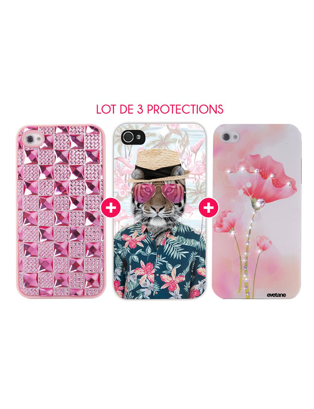 Pack 3 Protections Fashions pour iPhone 4/4S : Coque Crystaux + Coque Tigre tropic + Coque Fleur Strass